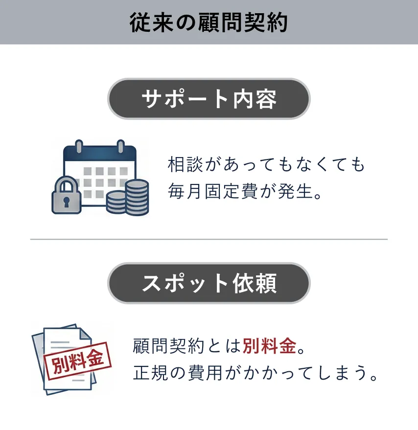 しかし実際には、定額の顧問契約までは踏み切れないという方が大半です。
